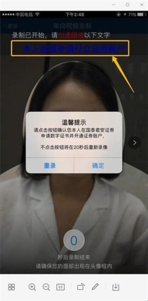 7、最后录制视频,保持平视镜头,倒计时结束时念“本人自愿申请开立证券账户”