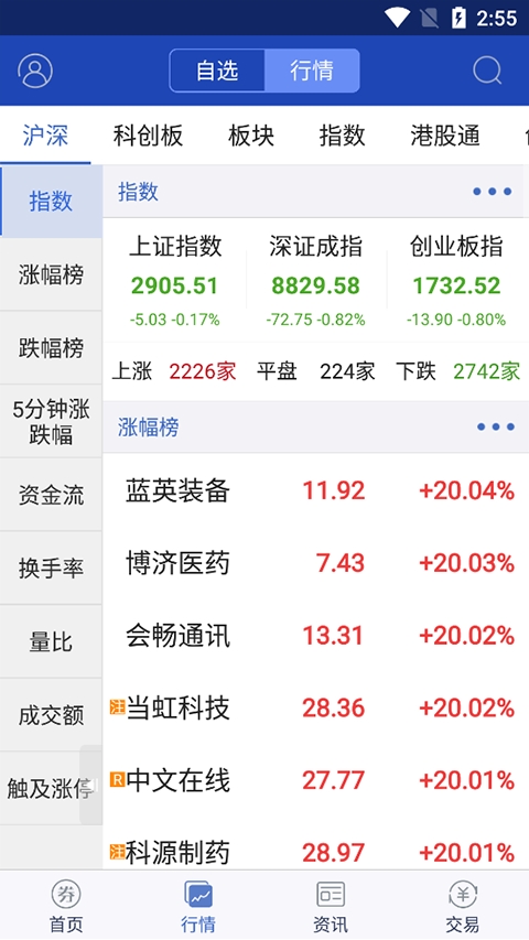 2、在“首页”中,可以看到涨跌排行、资讯、自选、新股申购、融资融券等;