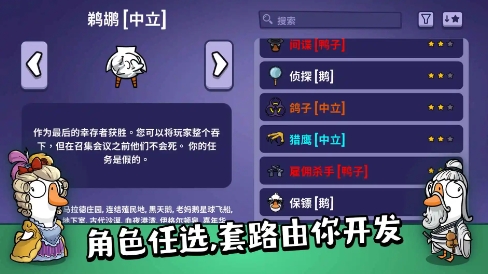 3、玩家将被随机分配到鹅阵营、鸭子阵营或者中立阵营中,不同阵营的角色也各自有着不同的技能。
