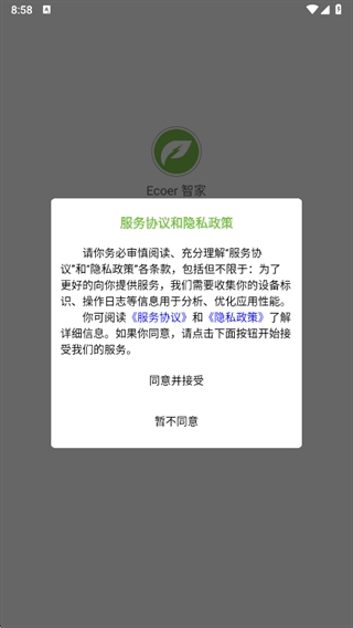 1、在本站下载并安装Ecoer智家App后打开,在初始弹窗中直接点击“同意”用户协议。