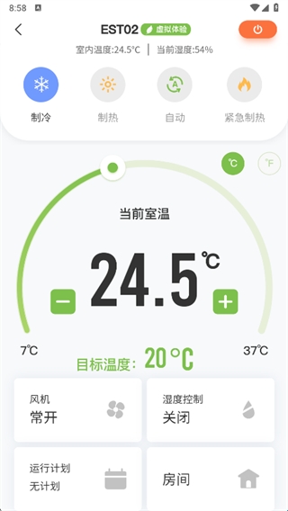 4、您可以远程调整空调的设定温度,切换制冷、制热、除湿或送风等运行模式,并调节风扇的运行速度。