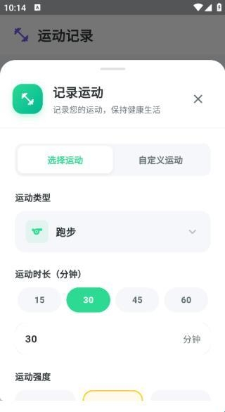 4、在运动记录页面中,选择运动类型、运动时长、运动强度,然后保存记录。