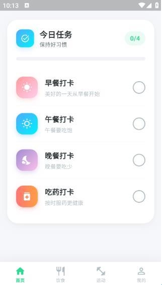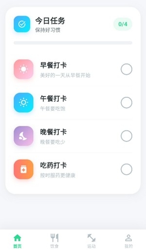 1、在首页中提供早餐打卡、午餐打卡、晚餐打卡、吃药打卡的功能;