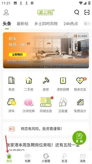 1、首页有新房、二手房等功能入口,还有拼车、求职招聘等服务,推张家港急聘岗位信息,可发帖互动。