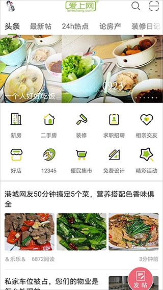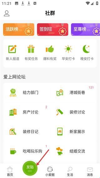2、社群页有新人报道、有奖任务等功能,爱上网论坛含房产讨论、装修讨论等板块,可发帖参与社群活动。
