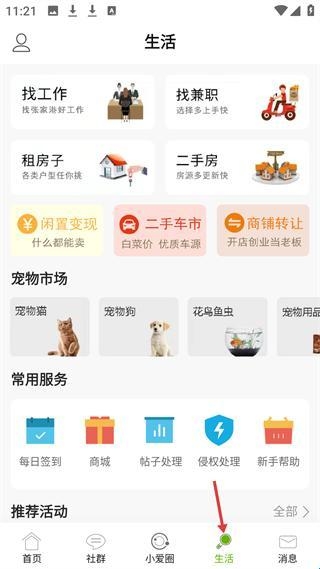 4、生活页有找工作、租房子等服务入口,还有宠物市场、常用服务板块,提供闲置变现、二手车市等生活服务。