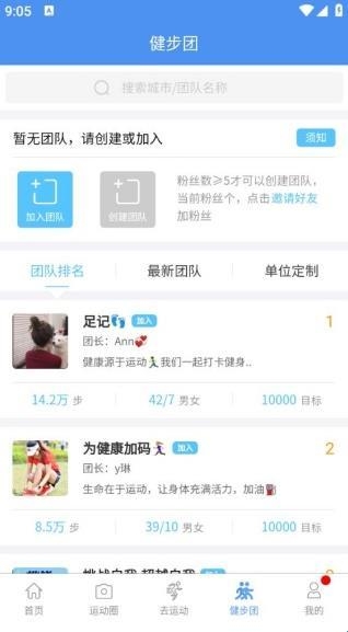 4、健步团,是可以去创建自己的团队,也可以加入到其他团队进行运动。