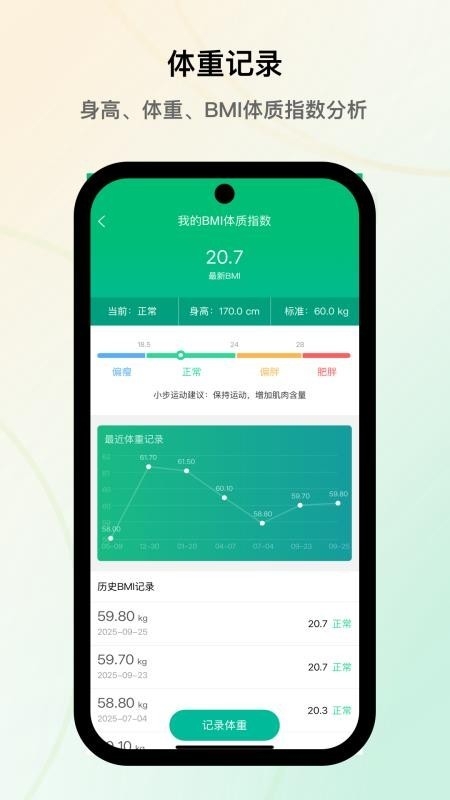 支持体重记录、BMI计算,帮助用户追踪身体指标变化。