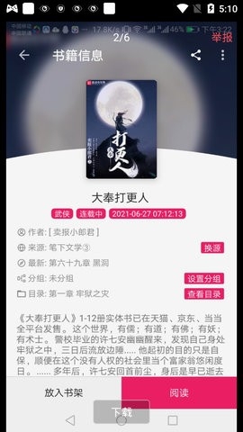 4、点击对应的小说,详情页面提供了加入书架,开始阅读以及切换书源等功能。
