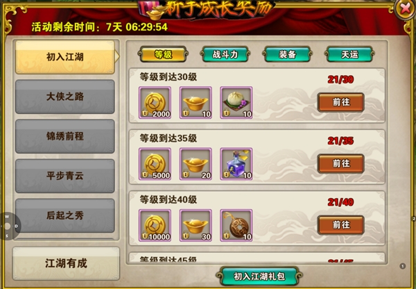 新手初入江湖,一定不能错过游戏内配套的养成激励活动。新手活动和新服活动的奖励十分丰厚,新手可以完全跟随活动任务的引导进行养成,领取大量额外奖励。同时新手新服活动也会开放对应的养成折扣礼包,可以高性价比购入大量养成材料。