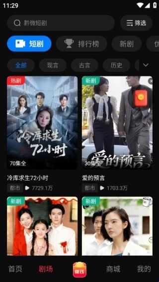 3、开放了大量的剧场,可根据排行榜,新剧,类型进行筛选。