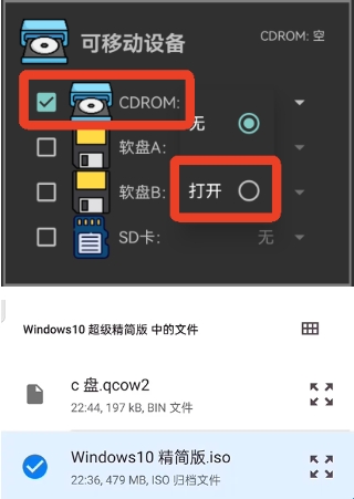 8、然后勾选【可移动设备】的一个,点击打开。这里打开已经下载好的镜像。