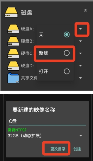 7、接下来来到硬盘栏,点击第一个硬盘A,新建一个映像输入名称,点击更改目录,选择一个目录创建映像。