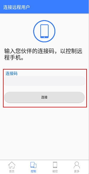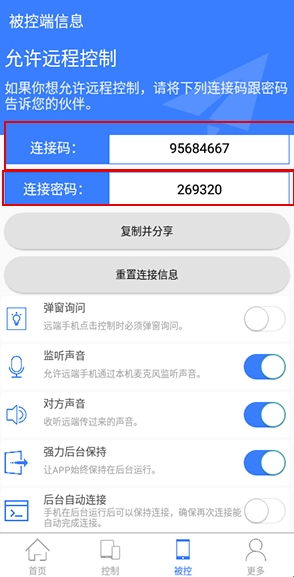 3、被控功能是你需要别人帮助的时候你把被控中的连接码给他他就可以连接你的手机;