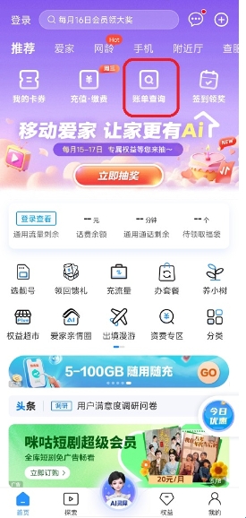 第一步:首页,点击账单查询,直接使用手机号码登录,轻松查看话费。
