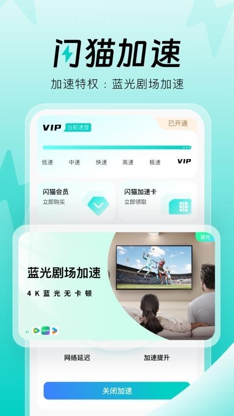 闪猫加速免费版,是一款功能强大的网络加速软件,软件内置强大的加速器,直播加速,畅享蓝光4k高清视频。使用游戏加速,将游戏延迟降低5倍,帧率提升200%,畅快游玩。软件建议用户开启会员服务,享受会员特权,轻松实现游戏无卡顿、直播观看流畅。此外,软件还能给随身wifi设备使用,提高网速哦。