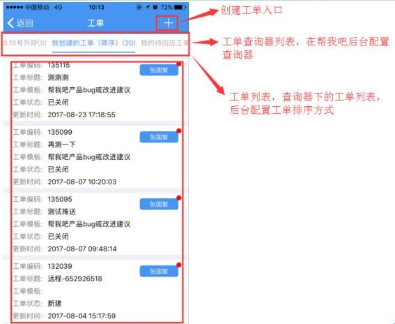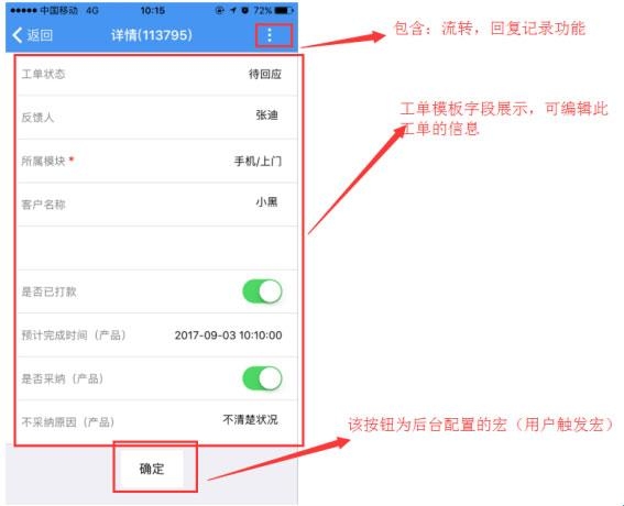 每个工单下的详情,显示的为该工单的模板字段;后台配置哪些字段可编辑、可见,宏的显示与隐藏,根据后台的配置完美展示(参考帮我吧后台工单相关设置)。