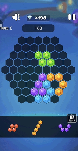 2、使不同的方块从上方掉落至六边形,进而消除同色三个方块,难度指数五颗星。