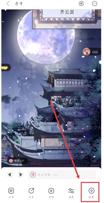 1、打开看漫画app,进入漫画中,点击右下角的设置。