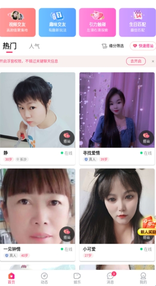 缘盼交友是一款超级好用的免费交友软件。软件内有视频交友、趣味交友、引力触碰、生日匹配等板块,为用户提供多种交友方式,并且首页还会根据用户喜欢进行专属推荐,帮助用户快速找到自己的缘分。软件所有用户的资料不仅详细直观,而且都是真实有效,感兴趣的朋友们赶紧下载体验吧。