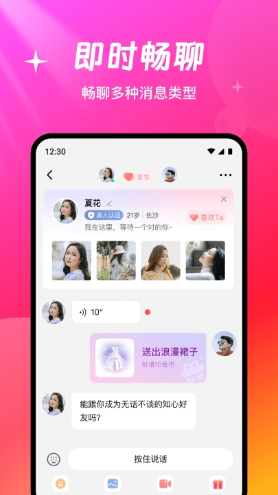 2、实时畅谈:聊天图片文字视频都可以,勇敢展现自己,为幸福努力。