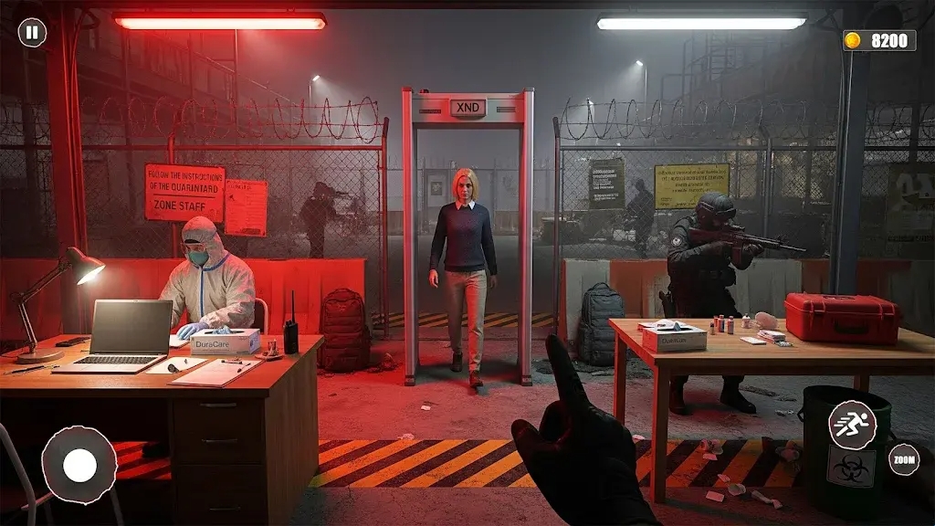 1、游戏开始时,玩家处于一个被铁丝网包围的检查站区域,周围有身穿防护服的工作人员和持枪警卫。玩家需要通过安检门,观察环境并准备应对可能出现的危险情况。