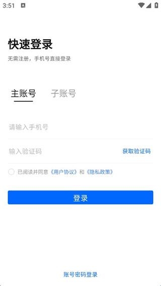 2、在这里提供主账号和子账号登录界面,输入手机号和验证码就能进入。
