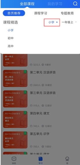 2、同时点击“课堂学习”主要就是提供了小学、初中、高中所有年级所有学科的免费网课
