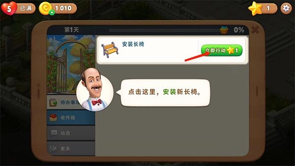 2、出现游戏任务了,我们需要在公园安装长椅,继续点击屏幕,