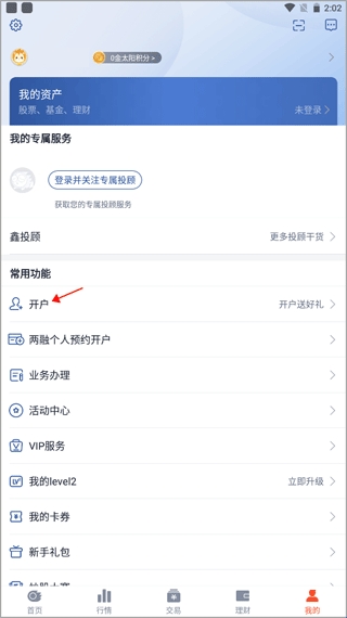 1、进入软件首页,点击上方的“开户”,也可以切换到【我的】中点击开户功能。