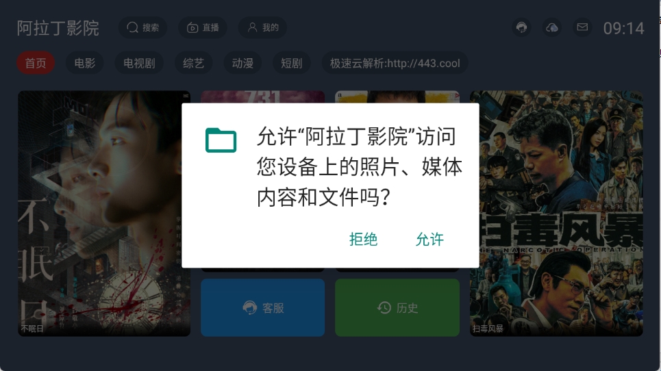 1、在游娱下载阿拉丁影院app,开启相关的权限。