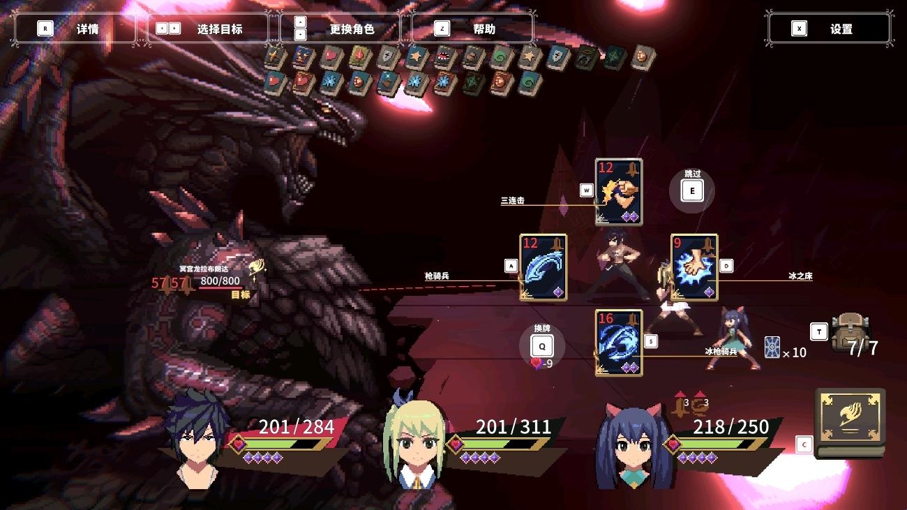 3、先说温蒂吧。超绝群体buff+闪避+偶尔比肩纳兹的超高爆发伤害。我感觉这个游戏,闪避真的是很重要的机制。一个60%闪避挂上去就能水灵灵地避开很多致命伤害(特别是到了后期有的boss a你一下就是几十上百的伤害,偶尔躲掉一两个真的是质变。明星单卡:①钢腕之力:超绝群体增伤+超绝魔法联动,钢碗配天空甲矢的伤害谁用谁知道。②疾驰之风:闪避真的很好用很好用!!!有时候逆天改命就靠闪避了。要是不喜欢赌博的话还是请老老实实温蒂+露西+格雷叠盾玩吧。③白月:高贵的免费卡片,也有一些很不错的魔法联动配合。④天空的波[风?](最后一个字我不会念):aoe伤害配减伤,个人建议配合附魔魔力-1服用。⑤照破天空穿:超绝灭龙奥义懂的都懂,打输出用的。⑥神的骑士:群体增伤,温蒂的核心机制。⑦龙之力:灭龙魔导士的独有机制,无条件伤害×2给予了温蒂和纳兹超高上限的输出空间,建议配合额外能量使用。个人常用小连招:龙之力+钢腕之力+天空甲矢,一回合伤害100+轻轻松松,要是有影龙支援技能or天空甲矢与天空乙矢的魔法联动伤害更高。⑦天空乙矢:队里有温蒂的情况下,要是在地牢里看到雪莉娅会直接送天空乙矢卡片和魔法联动技能。