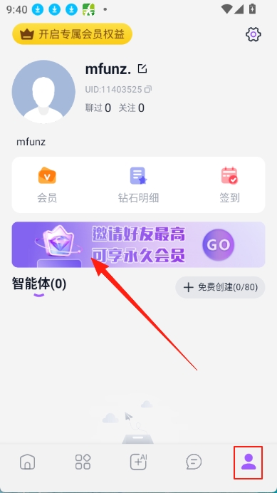 2、进入个人中心,点击中间的“邀请好友,享永久会员”横幅。