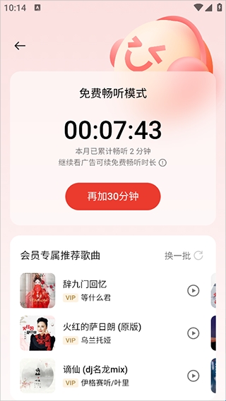 2、然后进入页面中进行免费开启即可,如之前开启过可以再次增加免费听歌时长