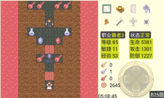 9F:过两个黄门拿钥匙和红宝石[L=62,A=21,D=24,G=59],再向左过黄门,打蝙蝠[L=48],拿钥匙和蓝宝石[L=48,A=21,D=25,G=62],回头一直下到7楼。