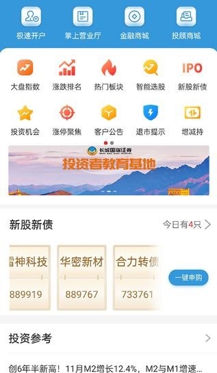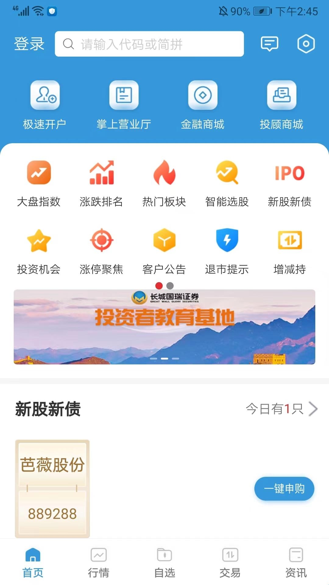 1、打开长城国瑞证券同花顺手机版,可看到分为首页、行情、自选、交易和资讯栏目,在当前首页界面,包括极速开户、掌上营业厅、金融商城、投顾商城、大盘指数、涨跌排名、热门板块、智能选股、投资机会、退市提醒等实用功能,用户可根据需求选择使用,