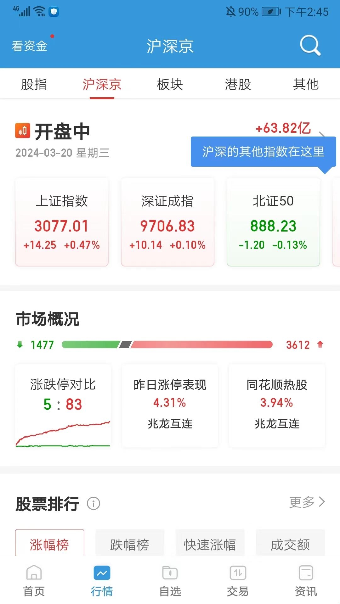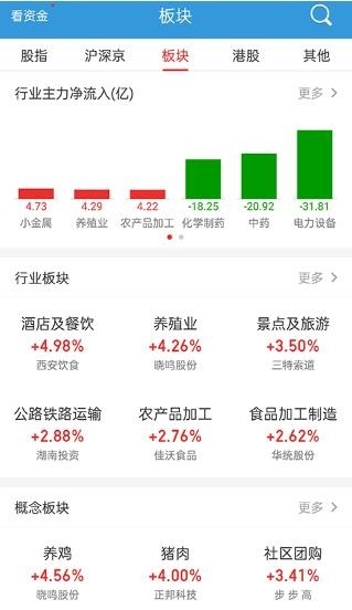 2、行情界面包括股指、沪深京、板块、港股和其他频道,