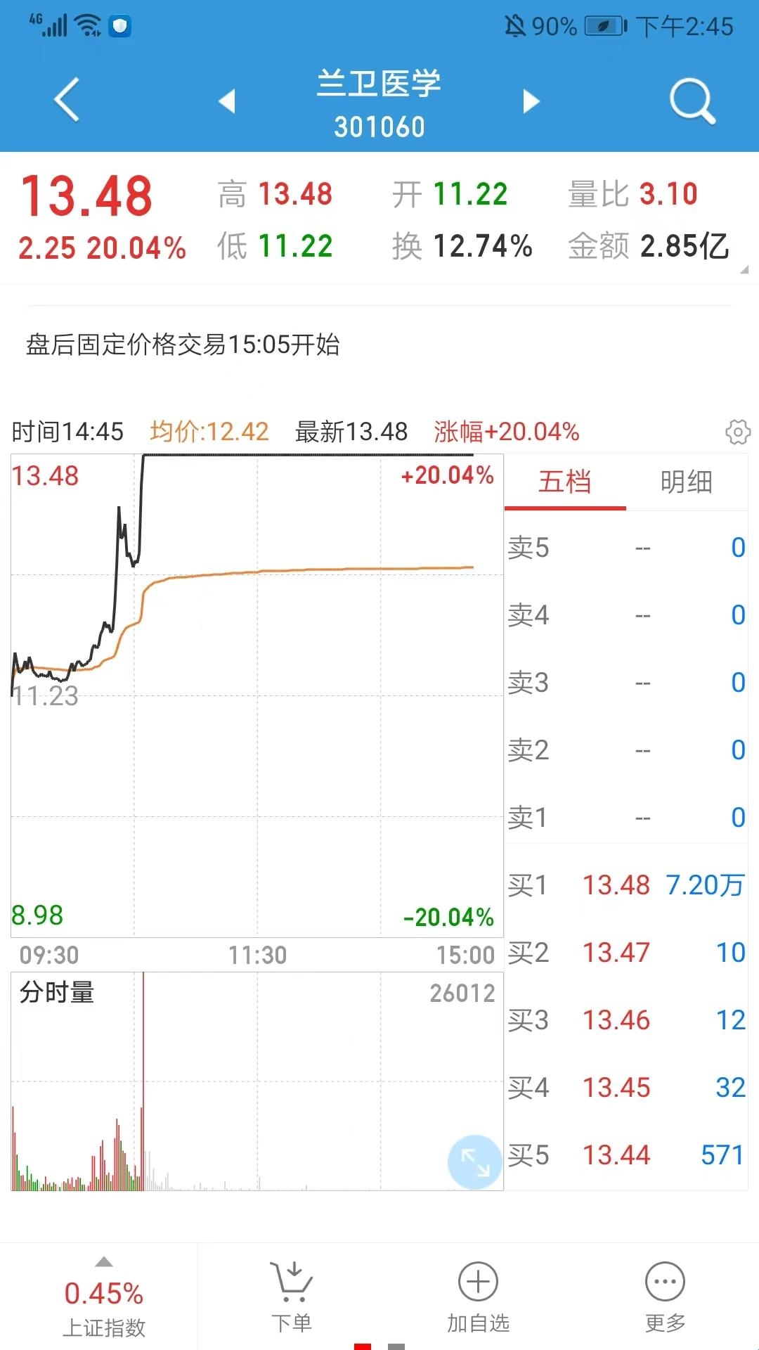 3、这里以兰卫医学为例,可以看到详细的交易和涨幅数据,