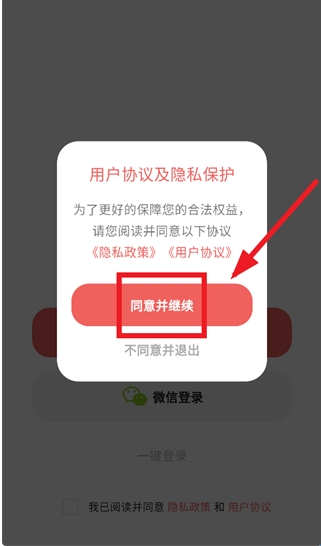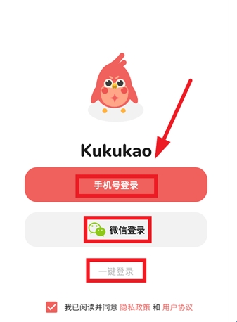 1、下载安装并打开kukukaoapp,在用户协议及隐私保护提示界面点击同意并继续;