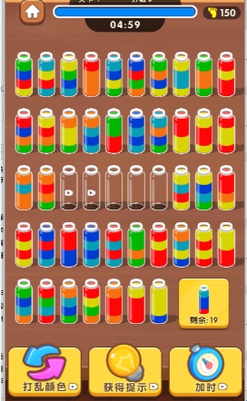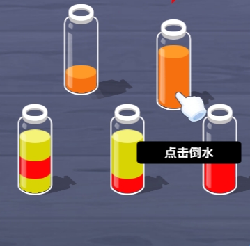 2、场面上有多个瓶子,瓶中的水按段分成不同颜色,将所有水都排序成功即可通关!