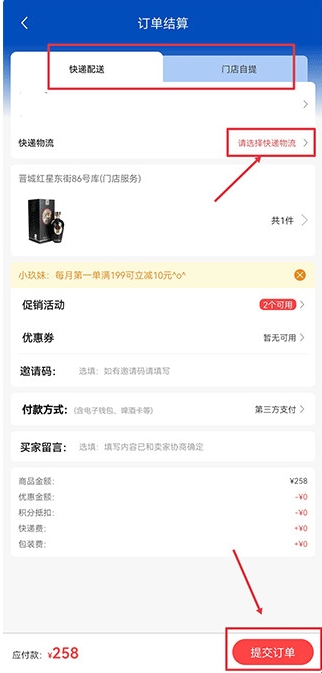4、选择门店自提或者是快递配送就可以下单购买了。