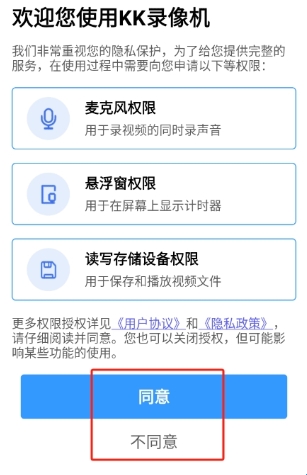 1、进入后我们同意KK录像机App的用户协议;