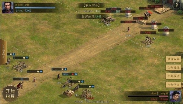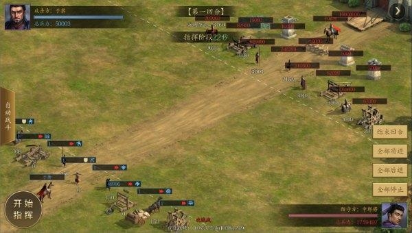 2、首先指挥停止铁骑兵,其余兵种前进一回合后停止。依次攻打敌方轻骑兵、铁骑兵、长枪兵、刀盾兵、冲车。