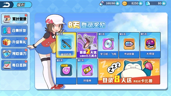 1、累计登录,第二天送化石翼龙,第八天送卡比兽。