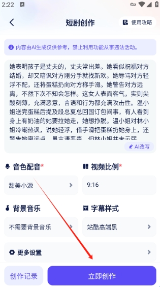 4、生成推广内容后了进一步进行编辑,编辑后点击“立即创作”开始生成推广作品。