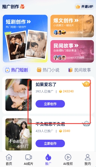 1、下载安装并打开妙笔工坊后点击【推广】专区,在推广页找到想要推广的短剧并点击“立即创作”;