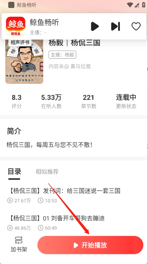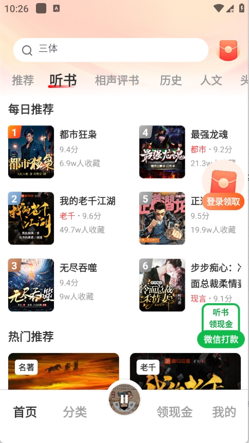 鲸鱼畅听是一款口碑很好的手机听书软件。这里有听书、相声评书、历史、人文等领域的资源,用户可以自由选择畅听,同时还能设置多种播放模式,调整喜欢、定时、倍速等功能。软件内置多种热门榜单,每个小说都有具体的评分、在听人数、章节数等信息,便于用户参考。感兴趣的朋友们快在本站下载吧。