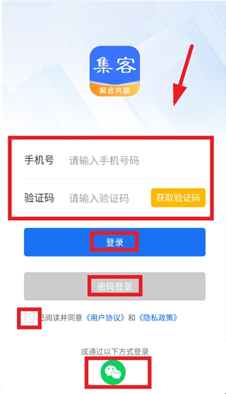 3、进入登录界面后输入手机号,验证码,勾选已阅读并同意 《用户协议》和 《隐私政策》,点击登录即可,还可以点击密码登录使用手机号密码登录,以及点击下方微信图标使用微信账号授权登录
