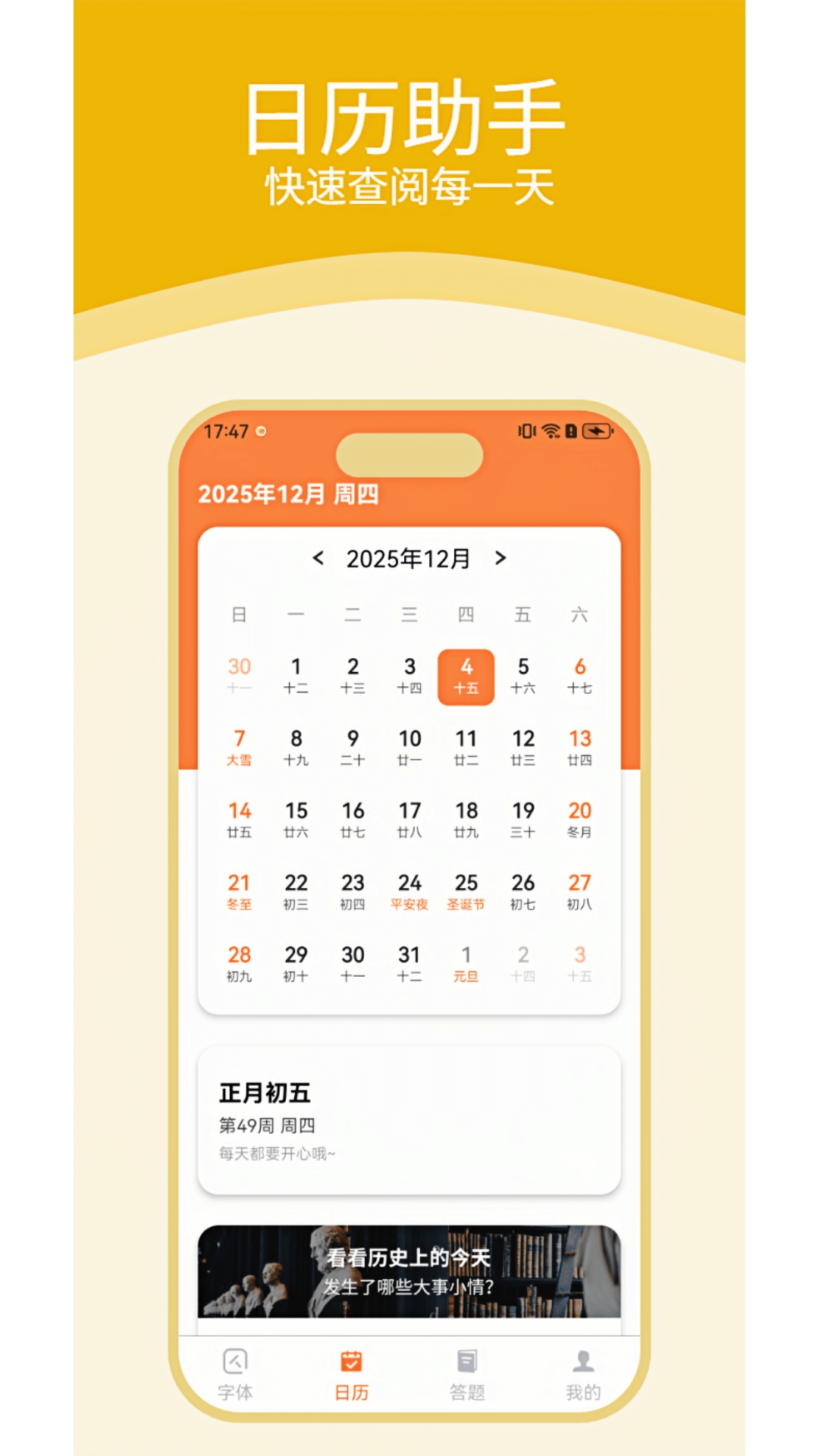 农历、节日节气、放假安排、吉日查询;让你变身时间管理高手。