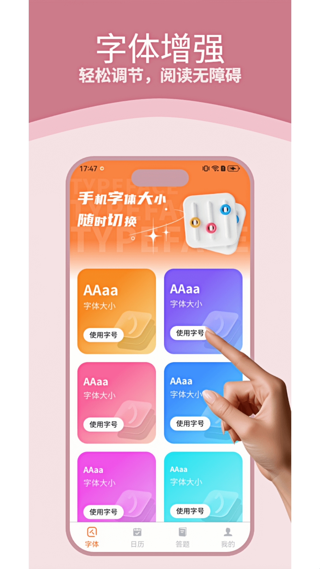 手机字体放大器,一款专为中老年用户打造字体放大软件。用户可以使用软件随时随地将字体切换成合适大小,也能使用系统自带的字号,逐渐放大的字体,满足不同用户的需求。软件不仅能放大字体,内置趣味问答,丰富中老年群体的生活,让他们也能成为成语小秀才。